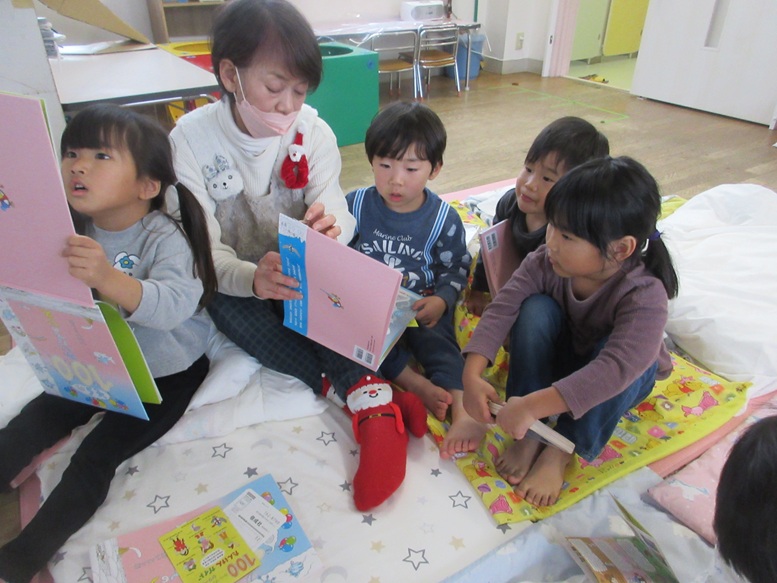 最近朝の会で絵本を読んでいます。「今日は何の絵本?」とこどもたちも楽しみにしますよ。少し長い絵本を読んでもしっかり聞いていて、物語も理解できているようで絵本を読み終わった後に絵本の話をするのも楽しんでいます。絵本に興味をたくさん持つようになってきていて、そらぐみさんの絵本はもちろん「事務所に絵本借りてくる」と事務所の絵本も借りて来て友だち同士で楽しんでいるそらぐみさんです。そして、少し早いですが今日はクリスマスメニューでした。トマトスープに星形のホワイトソルガムパスタが入っていて「星あった?」「いっぱい入ってる」と友だち同士で見せ合ったり大喜びで食べていましたよ。