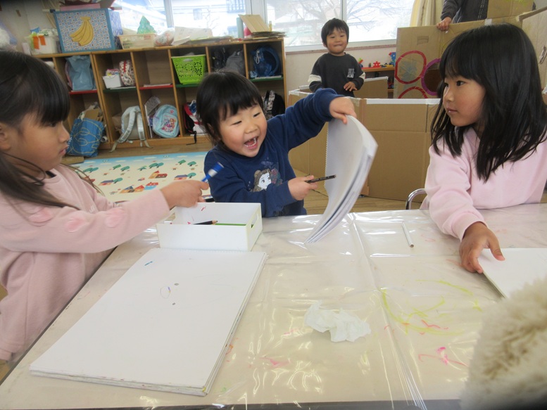 今日朝の会で1月30日にお店屋さんごっこをすることをこどもたちに伝えました。そらぐみさんがお店を開いてお客さん(他のクラスのこどもたち)が買いにくることを伝えると、「やりたーい」と声があがりました。「お客さんもしたい」と言う声もあり、にじぐみさんもお店を開くから買いにいけることも伝えるとより大喜びのそらぐみさんでした。何屋さんをしたいか聞くとジュース屋さんやアイスクリーム屋さん、スパゲティ屋さんなどいろいろ出てきましたよ。これから何屋さんにするか、どうやって作っていくかたくさん話をしながら、お店屋さんごっこの日まで楽しみながら色々作っていきたいと思います。
