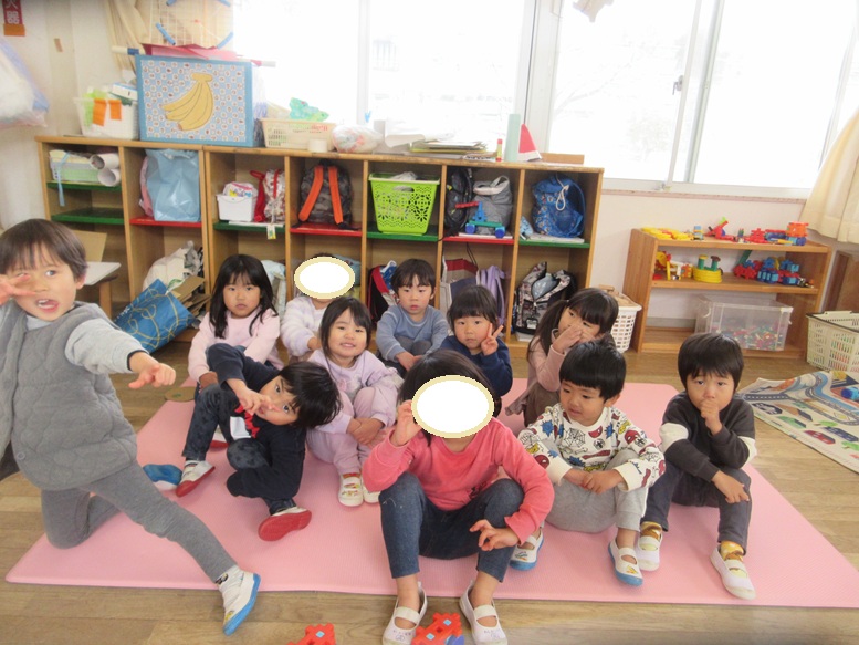 そらぐみさんで過ごす今年最後の日でした。明日・明後日から長いお休みに入ることを伝え、日数も一緒に数えると「えー!!」「いっぱい♪」と大喜びのこどもたち。お休みの日に何をするのかという話で盛り上がりましたよ。あいにくの雨でしたが、テラスでしゃぼんだまをしたり、お部屋で車を走らせたり、自由画帳に友だちの絵を描いたりと保育士や友だちとたのしく元気に遊びました。集合写真を撮ろうと保育士が声をかけるとすぐに集まりかわいい顔やかっこいい顔をしてポーズを決めるこどもたちでした。今年はありがとうございました。来年もよろしくお願いします。