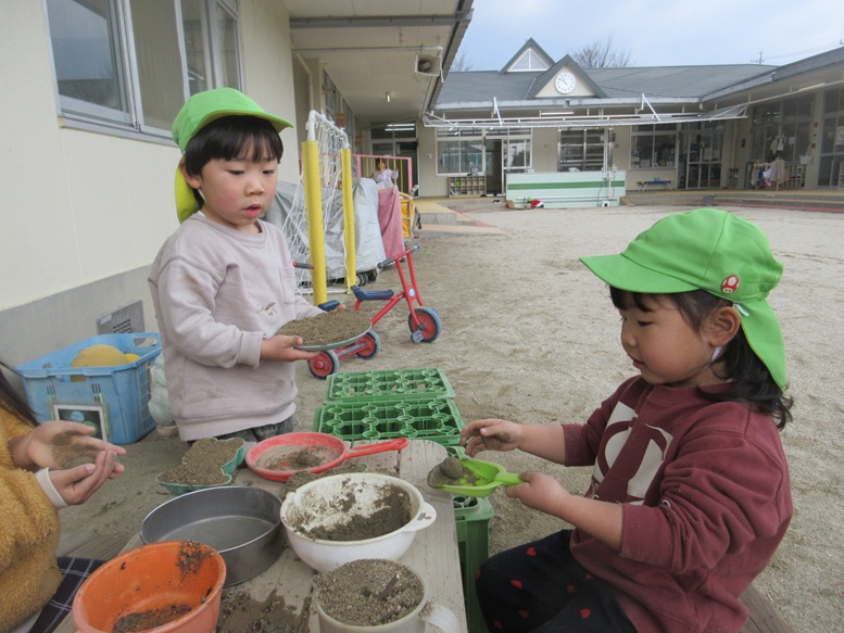 あけましておめでとうございます。今年もよろしくお願いします。年始初めての登園日で元気よく登園してきたそらぐみさん。お年玉をもらったり、ひいおじいちゃんに会ったことなどお休み中の出来事をたくさん教えてくれました。また、新しく買ったパンツやリュックサック、服なども興奮気味に見せるこどもたちでしたよ。少し寒さもやわらぎ園庭でどろだんごを作ったり、ピクニックごっこをしてたくさん遊びました。