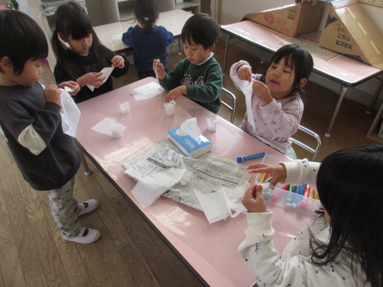 「かき氷作りたい」とこどもが保育士に伝えたのでティッシュを氷にみたててコップも用意するとティッシュを細かくちぎって作り始めると「なになに?」「何つくってるの?」とこどもたちが次々に集まってきて机がいっぱいに♪コップにティッシュをたくさんつめると「シッロップ入れないと」とペンでティッシュに色をつけ始めます。ペンの色が混ざったり水も少し入れたりと、色の変化も楽しんでいましたよ。いろんな色のかき氷ができました。