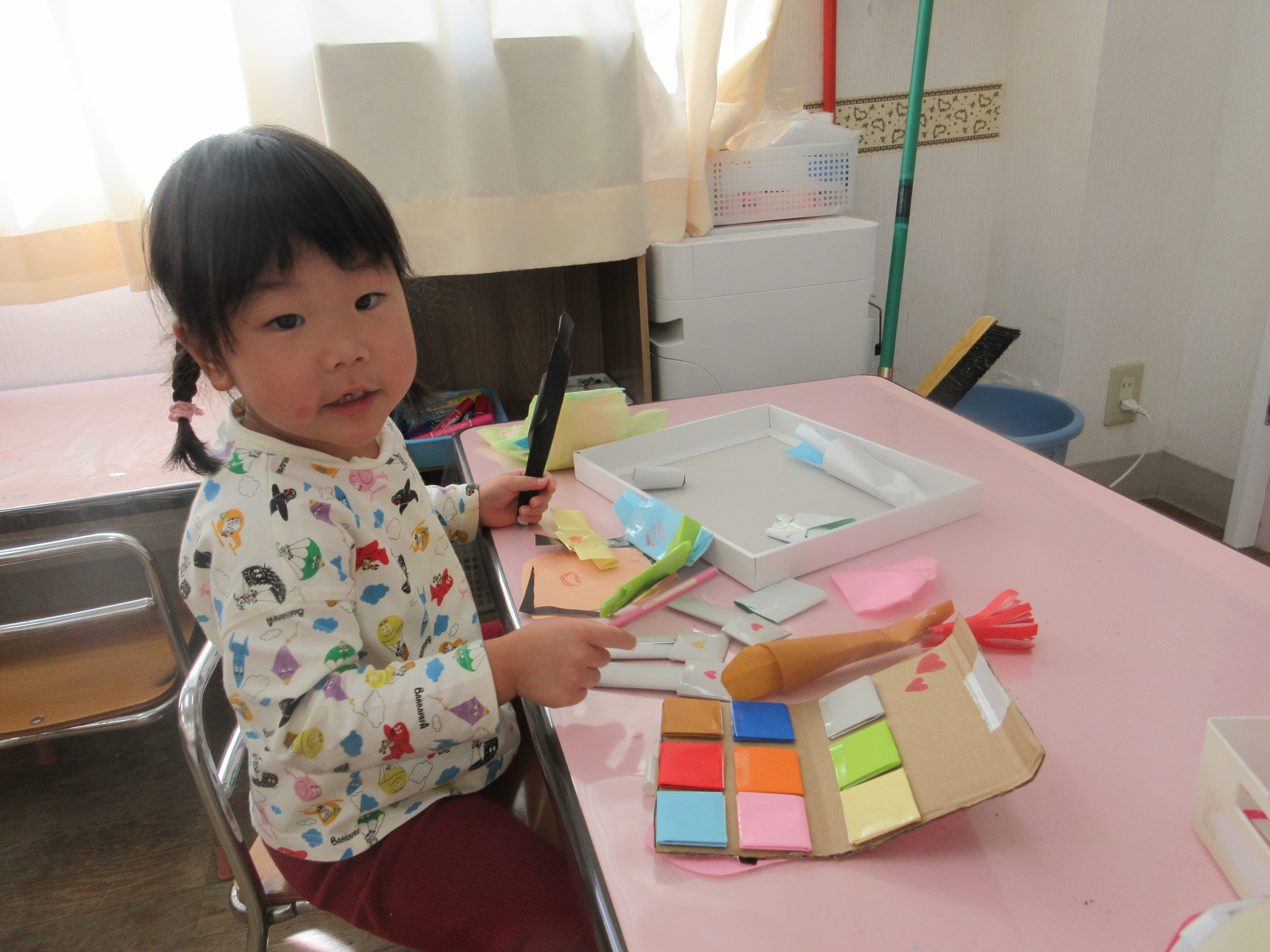 今日は外で綺麗な葉っぱを見つけたお友達がいたので、自由に画用紙にぺたぺた♪自分の思うように完成察せると大満足なあ表情を浮かべていましたよ。これから葉っぱの色も季節と共に変わっていくと思うので、こどもからの気づきがあるのか楽しみですね。そして、部屋チームは絵具遊びをしましたよ~