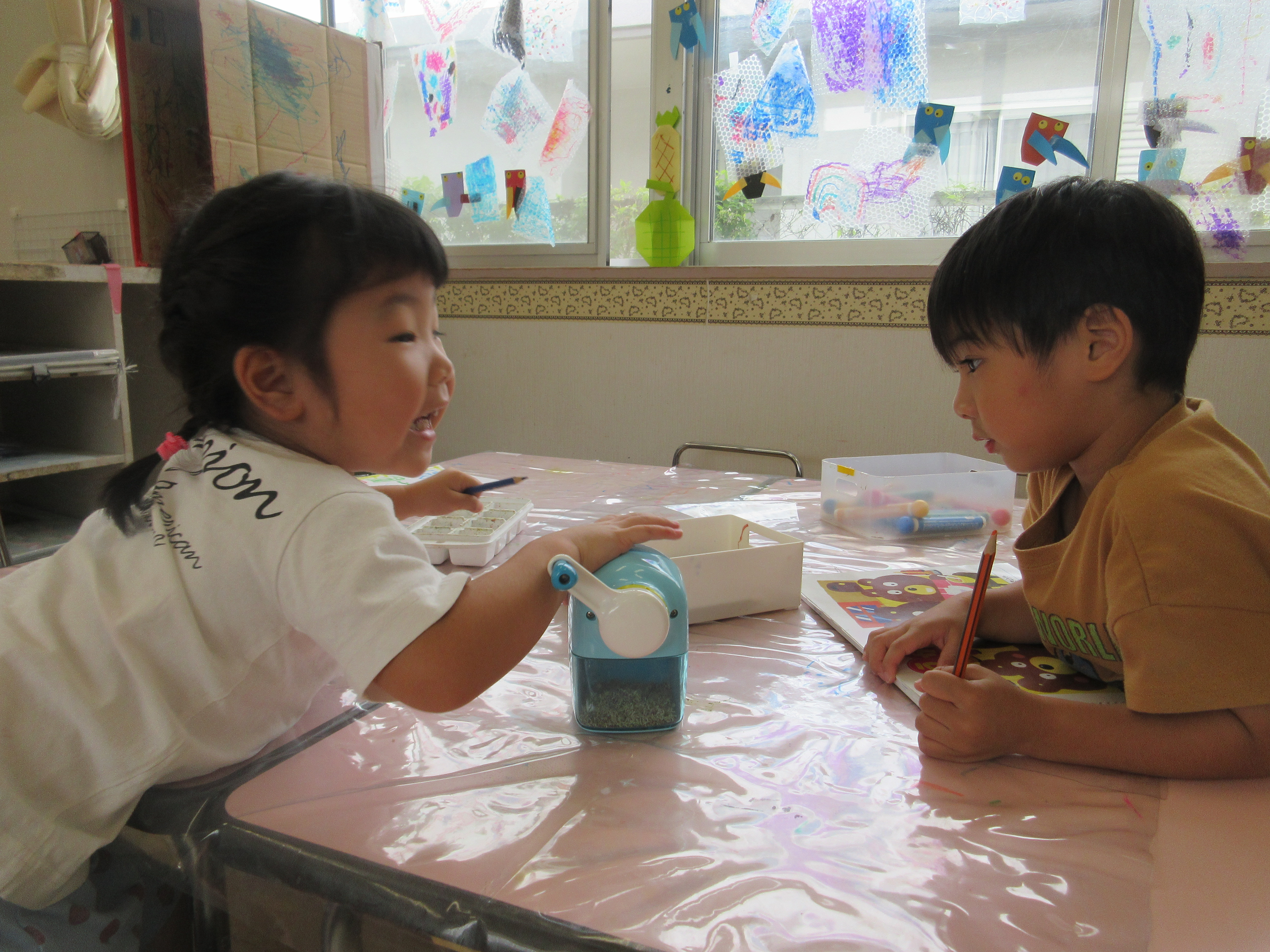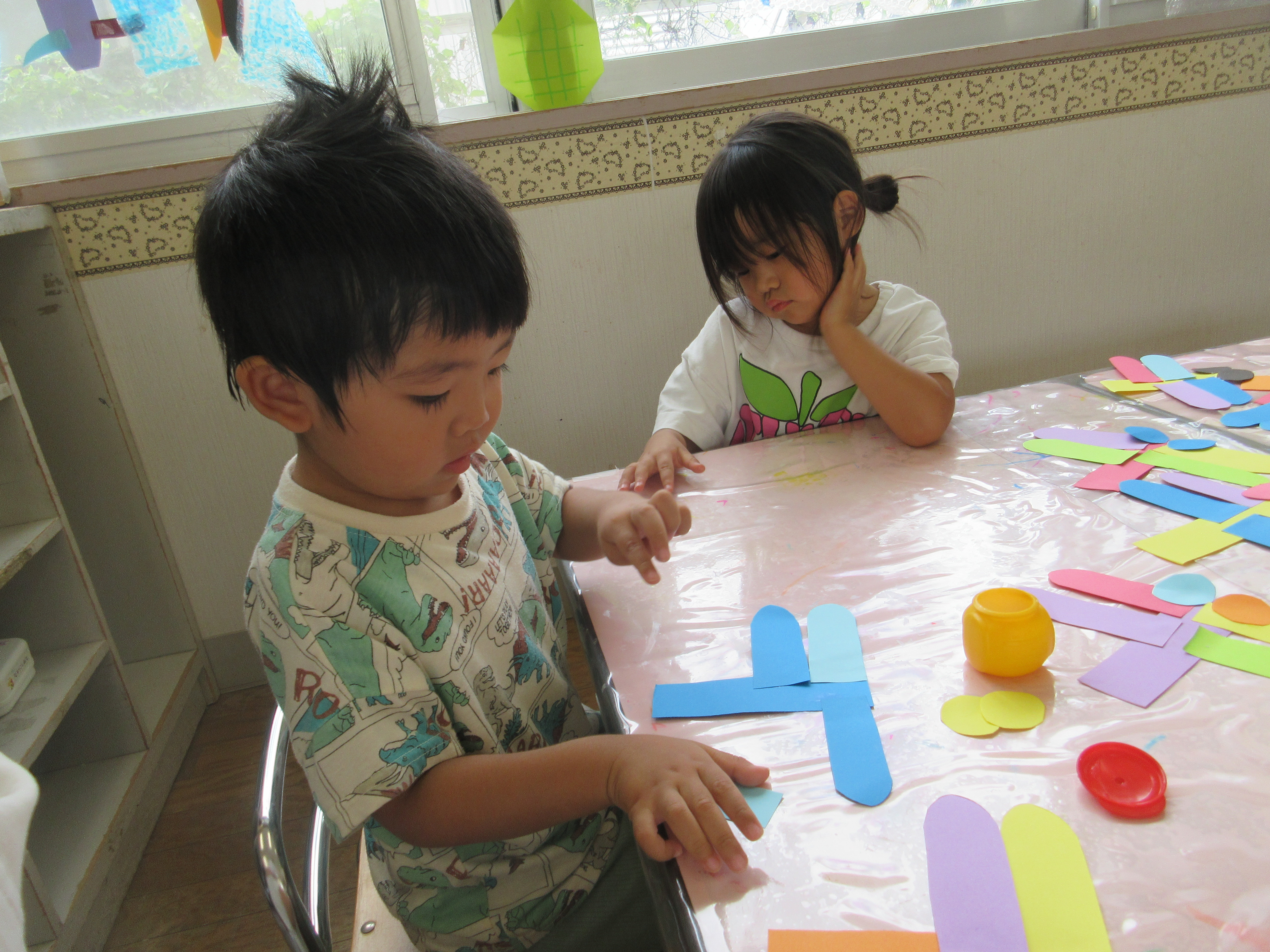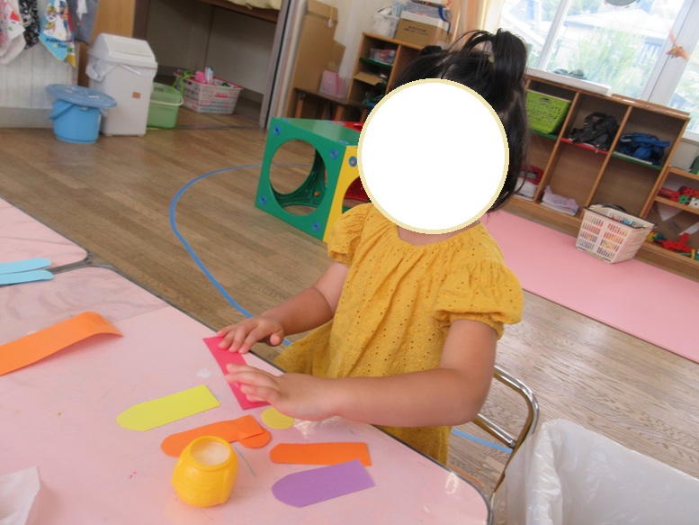 昨日とは違って今日は気温が下がり、涼しい一日でしたね。こども達も外遊びが気持ちいいようで、「行ってきまーす」と元気よく外へかけていくのでした。そんな中、、部屋では「セミの季節終わっちゃったね」と話をしていて、「トンボ作ろう」ということになり、トンボ制作がスタート!!前はセロハンテープを使ったけど、今回はのりを使ってみましたよ。指で取る量を考えたり、画用紙のどこにのりをつけるか考えたり…「こうであってる?」と不安そうに、でもできると嬉しくて何度も何度も挑戦するのでした♪また部屋に飾るので見てくださいね♪