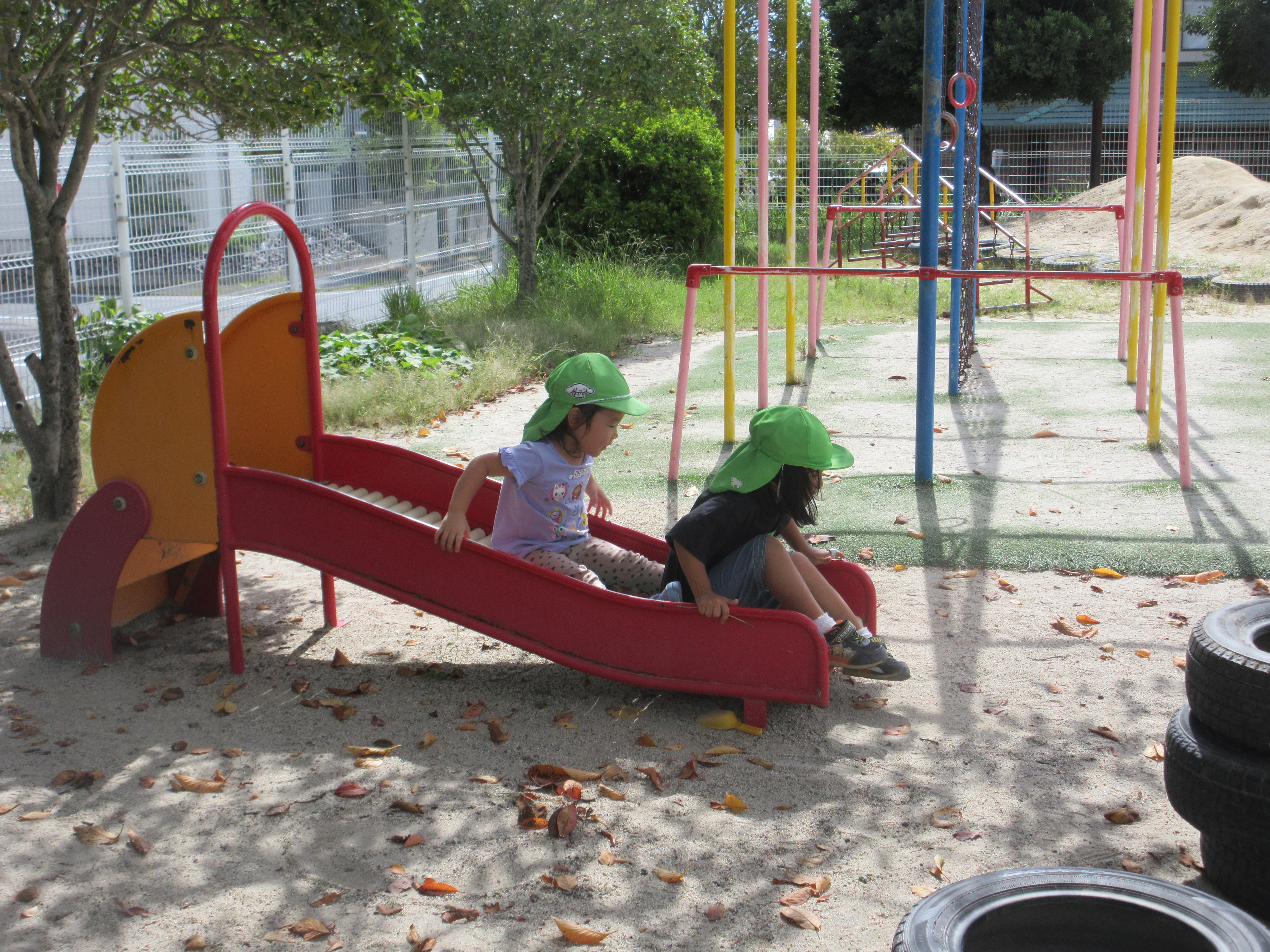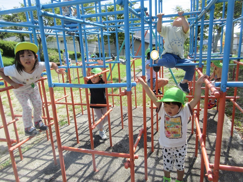 日中も涼しくなってきましたね。運動会の練習をした後、にじぐみさんの「散歩に行く」という声を聞いて「いきたいー!!」と大喜びのそらぐみさん。にじぐみさんと一緒に隣の公園に行きました。久しぶりの散歩にウキウキで歩いていましたよ。公園では追いかけっこをして走り回ったり、かくれんぼをしたり、遊具で遊ぶなど好きな遊びを楽しみましたよ。