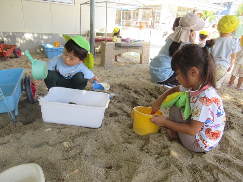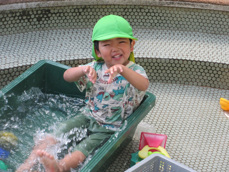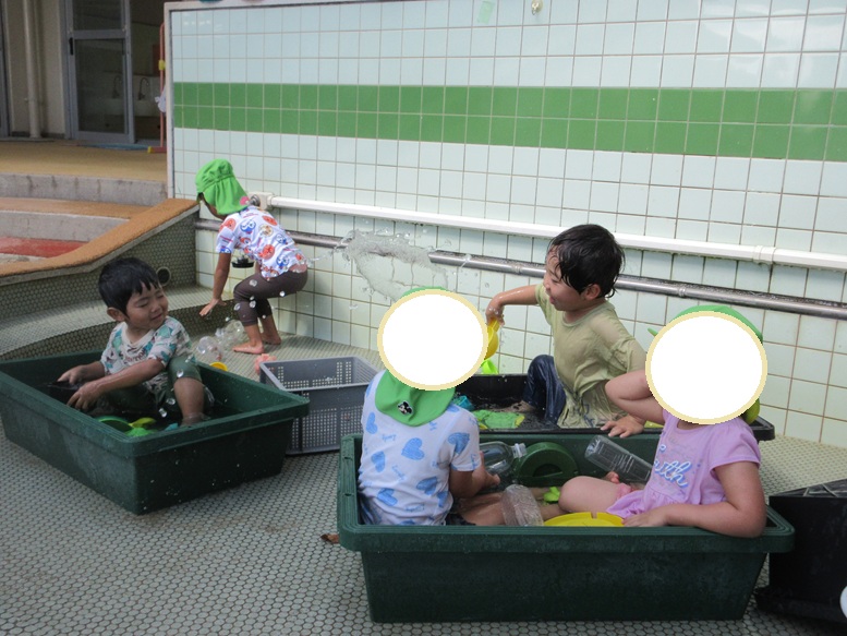 今日は少しぽかぽかしていて暑かったからか、砂場で泥遊びがスタート!!物足りなくなってきてちょう組前の足洗い場へ移動し水遊びへと変わっていきました。風があったのでひんやりするかなと思い、水ではなくお湯をためるとお風呂気分を感じるこどもたちです♪プールを経て水に慣れた子が多く、掛け合いをギャーギャー大騒ぎしながら楽しいんで居ましたよ。