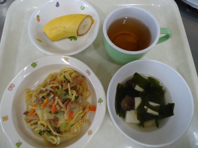 【塩焼きそば】人参、ピーマンは千切り、もやし、キャベツは小さくザク切りにします。豚肉とカットした野菜を油で炒め(しょうゆ、オイスターソース、鶏ガラスープの素、塩コショウ)で味を付け、蒸した中華麺を入れて混ぜ合わせ最後にごま油を加えます。人気メニューで今回も完食でした。
