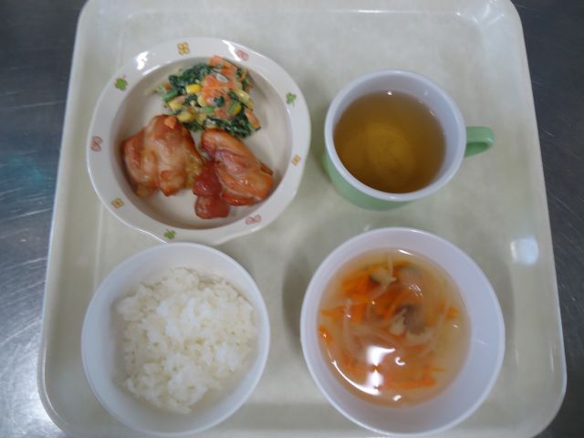 【スープ】たまねぎ、しめじ、にんじんが入ったコンソメ味のスープでした。