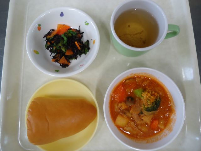 【豚肉のトマト煮】豚肉・玉ねぎ・人参を炒め、水を加え煮ます。沸騰したら、じゃがいも・しめじ・トマトペースト・コンソメ・トマトケチャップを加えじゃがいもが柔らかくなったら、ブロッコリーを加えさっと煮ます。