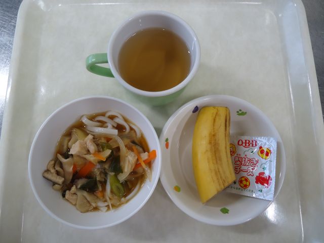 【はるさめスープ】人参・小松菜が入った鶏がらスープに、下茹でした春雨を加えます。もちもちした食感が好きなようで、毎回完食してくれる人気メニューです。