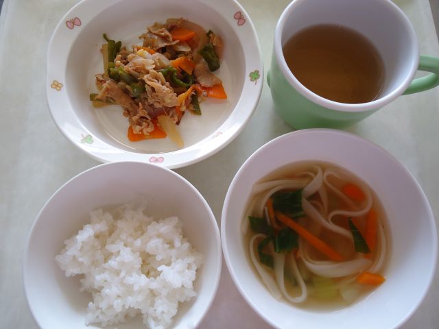 【塩焼きそば】人参、ピーマンは千切り、もやし、キャベツは小さくザク切りにします。豚肉とカットした野菜を油で炒め(しょうゆ、オイスターソース、鶏ガラスープの素、塩コショウ)で味を付け、蒸した中華麺を入れて混ぜ合わせ最後にごま油を加えます。人気メニューで今回も完食でした。