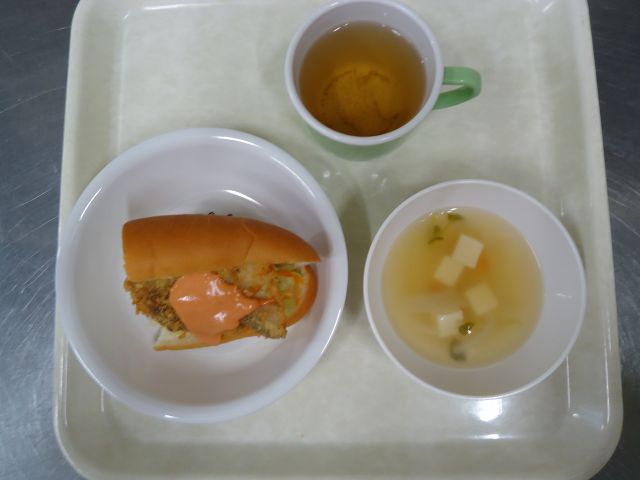 今日はパン食でした。未満児さんはパンとフライ、カレーきゃべつは別々にいただき、以上児さんは パンにカレーきゃべつ(千切りにしたキャベツ、にんじんをコンソメとカレー粉で茹でて冷まして水分をしぼりました。)をひき、ホキのフライをのせオーロラソース(ケチャップ、マヨネーズ風調味料)をお好みでかけてはさんでいただきました。スープは豆苗、玉ねぎ、豆腐が入ったコンソメスープでした。